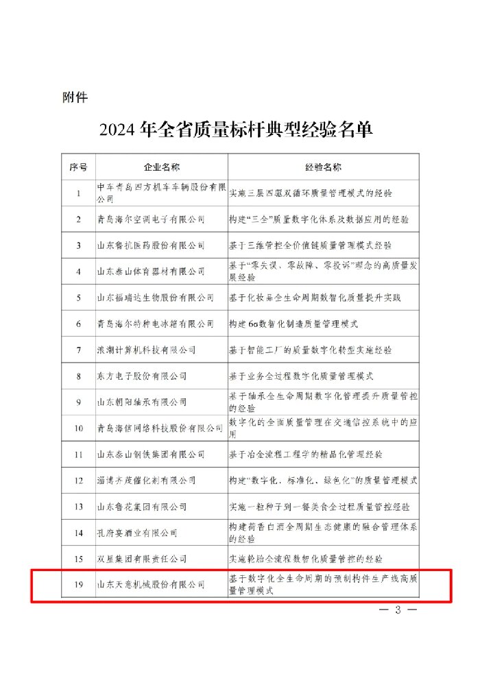 近日,山東省工業(yè)和信息化廳公布了全省質量標桿獎。天意機械憑借在關鍵過程質量控制方向的不懈探索,以基于數(shù)字化全生命周期的預制構件生產線高質量管理模式斬獲“2024年全省質量標桿”。
