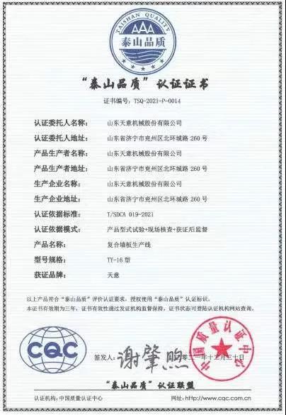 下一步天意機械將根據(jù)行業(yè)發(fā)展導向,堅持改革創(chuàng)新,持續(xù)提升企業(yè)智能制造水平,引導企業(yè)向著品牌高端化扎實邁進。天意機械多次獲得國家級榮譽、省級知名品牌、優(yōu)質品牌、省高端品牌培育企業(yè)等榮譽,此次天意機械獲得“泰山品質”產品認證證書,將更有利于企業(yè)品牌價值的提升和高品質形象的塑造,有利于提升企業(yè)的市場競爭力。