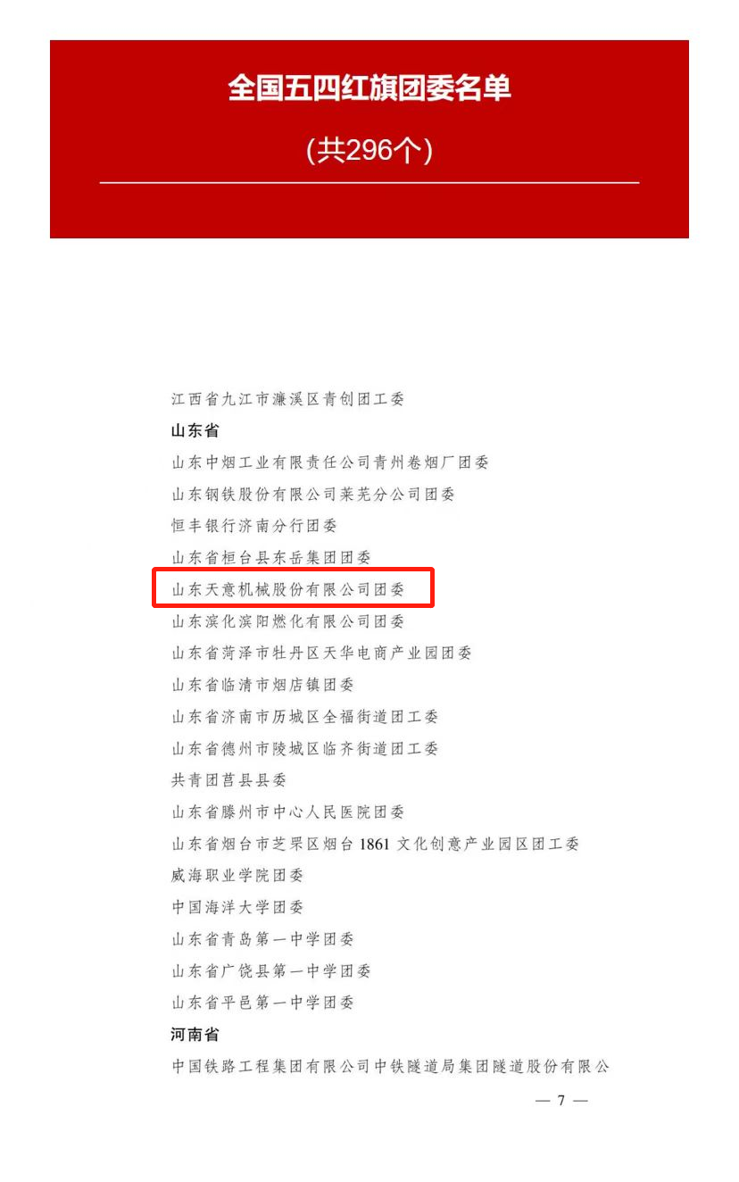 2023年是全面貫徹落實(shí)黨的二十大精神的開局之年。近日,共青團(tuán)中央作出表彰決定,授予296個(gè)團(tuán)組織全國五四紅旗團(tuán)委稱號;授予389個(gè)團(tuán)組織全國五四紅旗團(tuán)支部稱號;授予481名同志(含追授1名)全國優(yōu)秀共青團(tuán)員稱號;授予342名同志全國優(yōu)秀共青團(tuán)干部稱號。山東天意機(jī)械股份有限公司團(tuán)委榮獲全國五四紅旗團(tuán)委榮譽(yù)稱號。