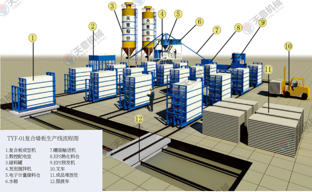 TYF-01型立式復(fù)合墻板生產(chǎn)線,設(shè)備占地面積小,產(chǎn)品一次成型,產(chǎn)量高。主機(jī)配有自動(dòng)行走系統(tǒng),設(shè)備運(yùn)轉(zhuǎn)更簡(jiǎn)單快捷,大型固定式攪拌設(shè)備,攪拌料漿更均勻,澆注效率更高。 工藝流程