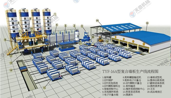 TYF-16A型復(fù)合墻板生產(chǎn)線是天意機(jī)械公司綜合國(guó)內(nèi)外技術(shù)經(jīng)驗(yàn),開(kāi)發(fā)研制的新型墻體板材生產(chǎn)線。復(fù)合墻板生產(chǎn)線主要分為配料系統(tǒng)、攪拌系統(tǒng)、發(fā)泡系統(tǒng)、數(shù)控配電系統(tǒng)、墻板成型系統(tǒng)、料漿泵送系統(tǒng)、EPS預(yù)發(fā)系統(tǒng)、液壓循環(huán)系統(tǒng)、整體出板系統(tǒng)。