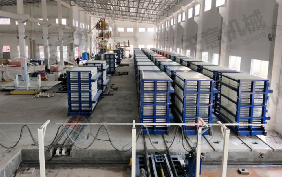 該復(fù)合墻板生產(chǎn)線立式旋轉(zhuǎn)臥式出板復(fù)合墻板成型機(jī),一次可生產(chǎn)四十塊墻板,該生產(chǎn)線主要分為:配料攪拌系統(tǒng)、墻板成型系統(tǒng)、液壓整體開模系統(tǒng)、液壓翻轉(zhuǎn)系統(tǒng)、整體出板翻轉(zhuǎn)碼垛系統(tǒng)、成型機(jī)自動(dòng)循環(huán)系統(tǒng)、變頻擺渡系統(tǒng)、數(shù)控配電系統(tǒng)等部件 組成。該生產(chǎn)線自動(dòng)化程度高,液壓開合模,解決了傳統(tǒng)立式復(fù)合墻板機(jī)人工開合安全隱患,提高了工作效率。設(shè)備配有整體出板碼垛系統(tǒng),解決了傳統(tǒng)人工出板方式,減少產(chǎn)品的破損率,提高了產(chǎn)能。生產(chǎn)線使用密封式泵送系統(tǒng)配備雙工位注漿槍,注漿速度快密實(shí)度高,材料粘結(jié)更緊密。