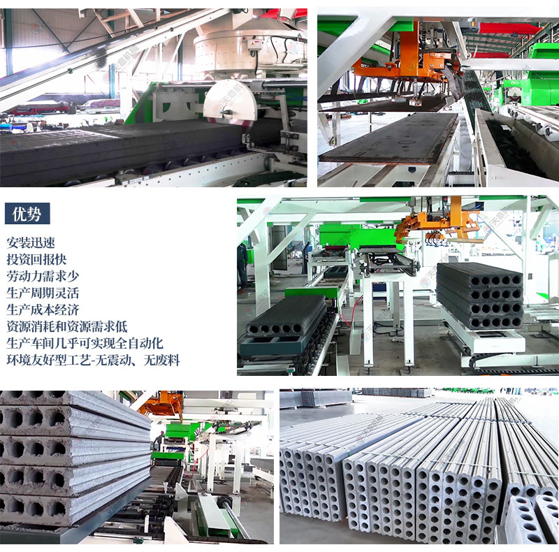 該機利用各種建筑垃圾的固體廢棄物、工業(yè)爐渣,粉煤灰,植物秸稈,頁巖等材料生產(chǎn)的輕質(zhì)隔墻板是環(huán)保、節(jié)能、利廢的新型建材,符合建筑模數(shù),能實現(xiàn)生產(chǎn)的標準化、系列化、通用化、建筑施工干作業(yè),比各種砌塊和磚的墻體至少可以提高施工效率3倍以上。